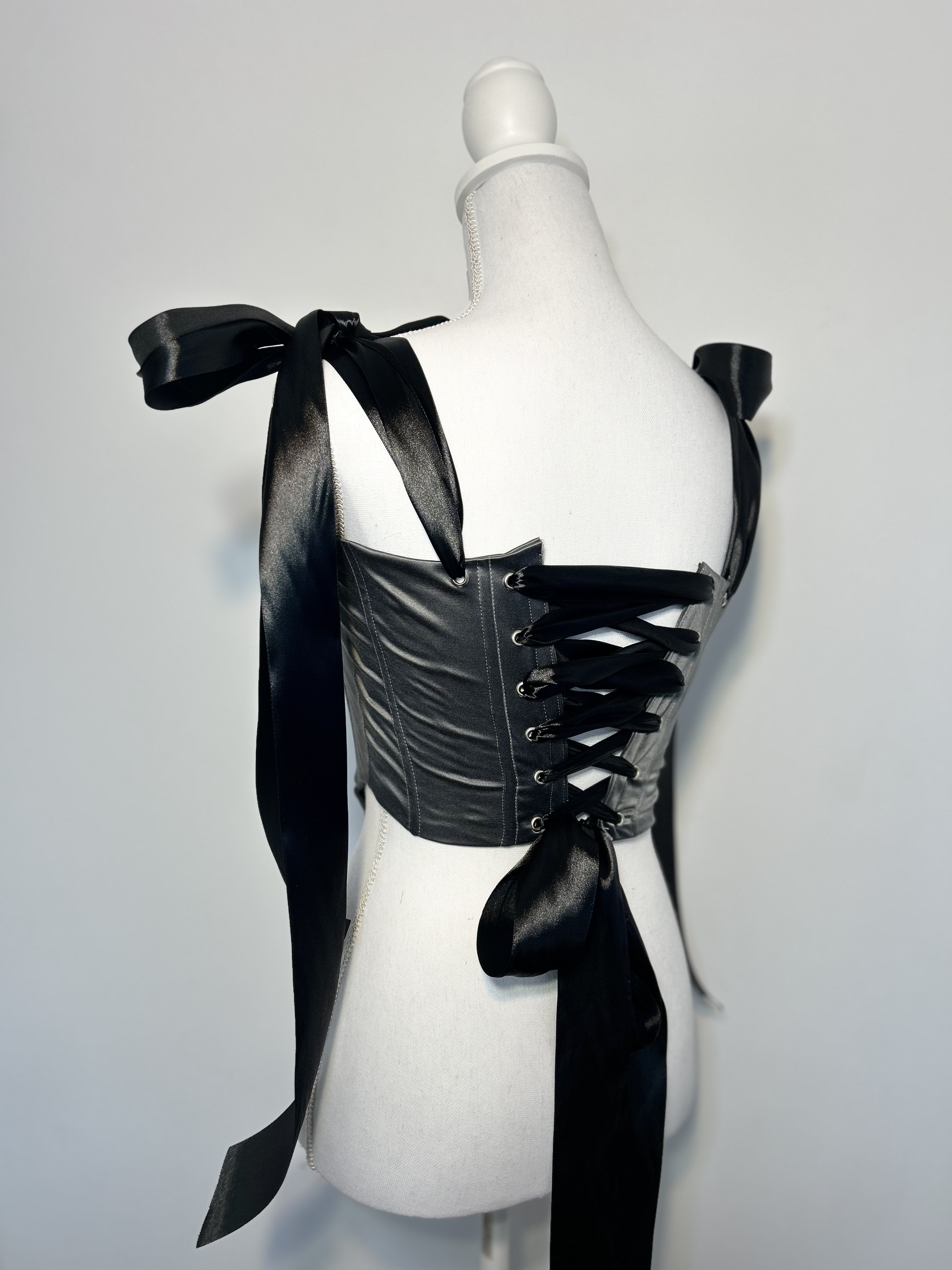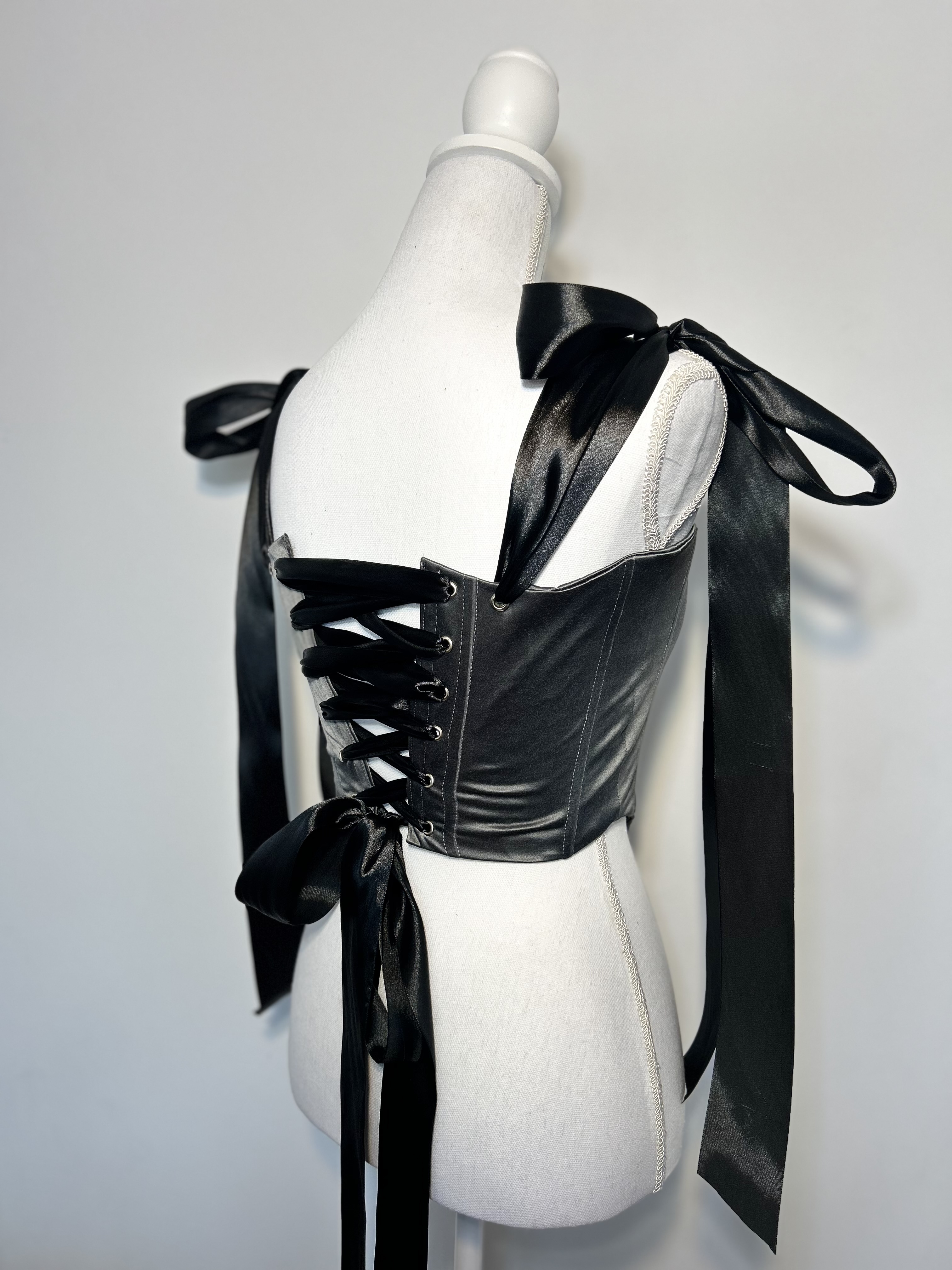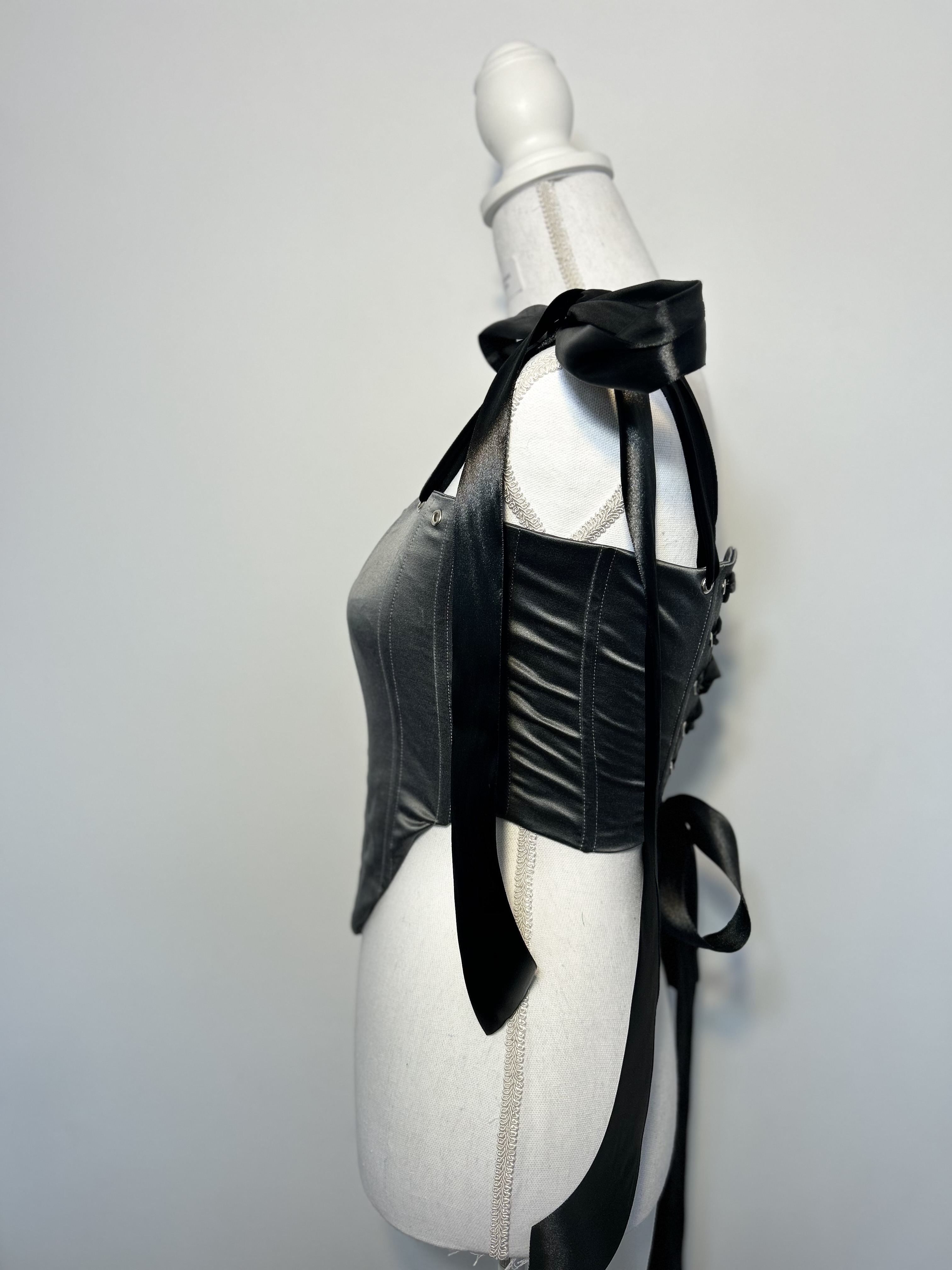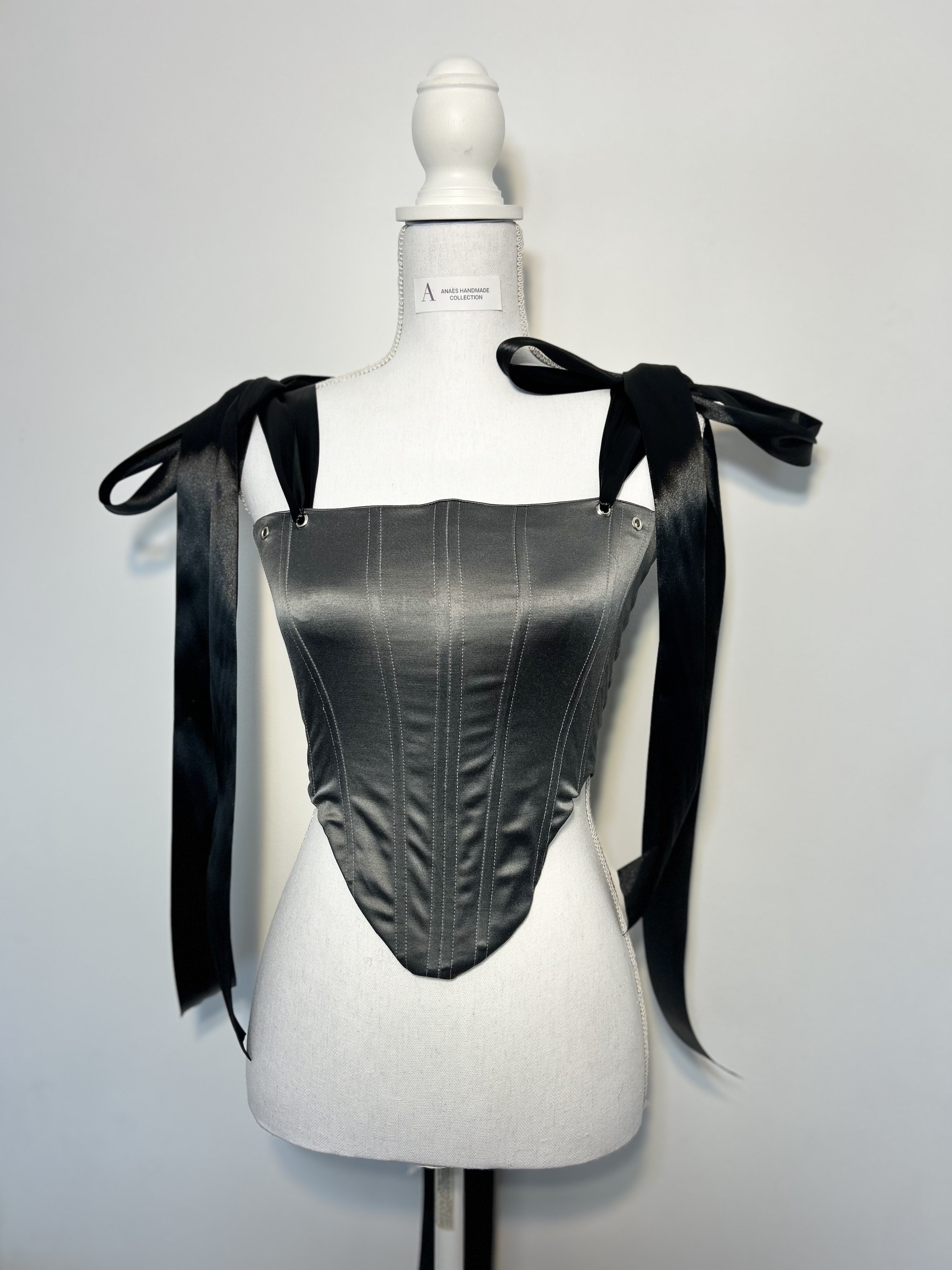 Corset elegant din tafta negru, cu bretele lungi care se pot lega pe umeri, pentru styling versatil. Cusăturile verticale subțiază vizual talia, iar luciul discret adaugă un accent sofisticat oricărei ținute.